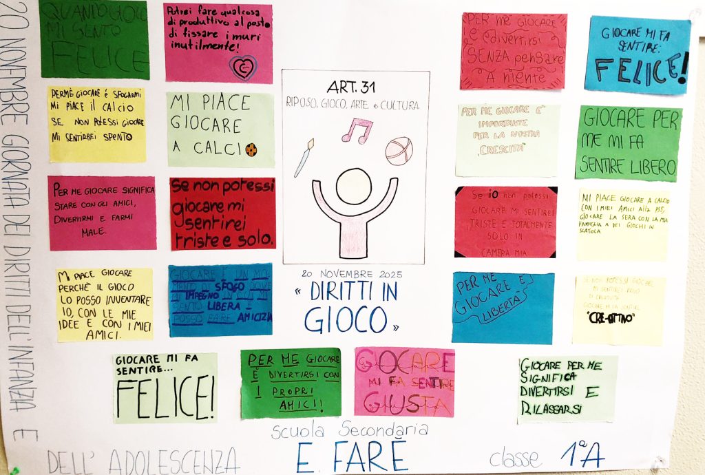 Agli alunni delle classi prime è stato chiesto di pensare a questo, soffermandosi sulla necessità che ogni bambino nasca nel diritto indiscutibile al gioco, al riposo ed alla partecipazione ad attività ricreative adeguate all’età. Diritto indiscutibile ma a rischio in molti dei Paesi con prevalente disagio educativo, economico e sociale.